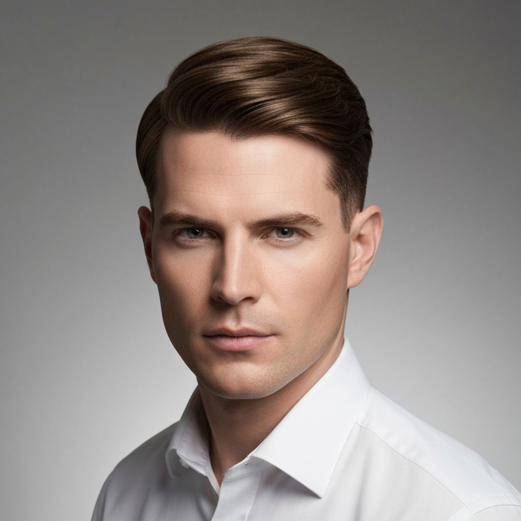 Sleek look with longer hair combed to the side. Sophisticated and professional.