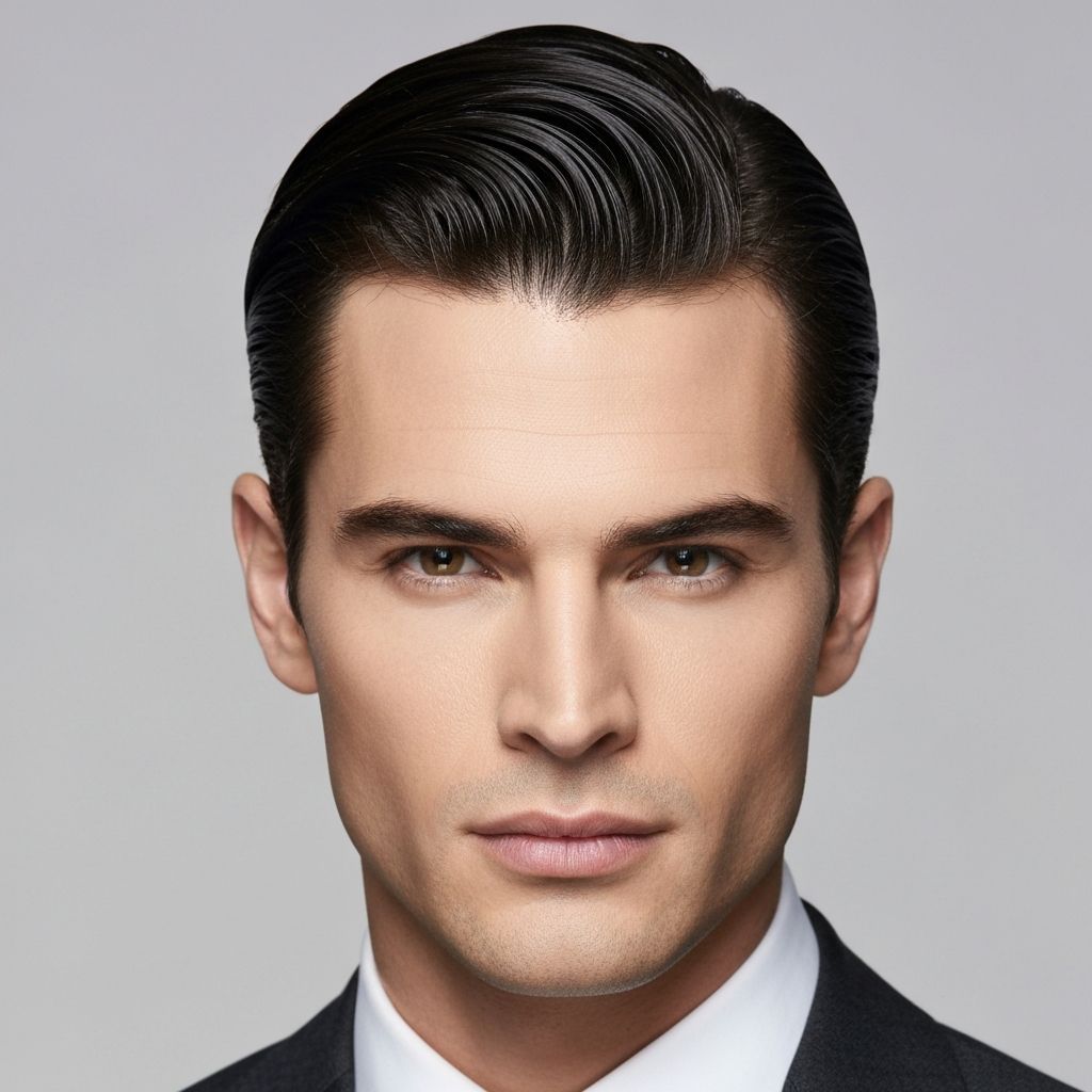 Hair slicked back with product. Smooth, polished finish with attitude.